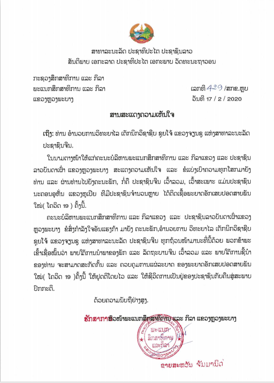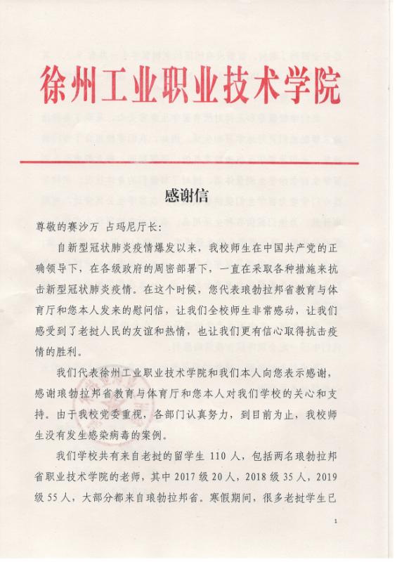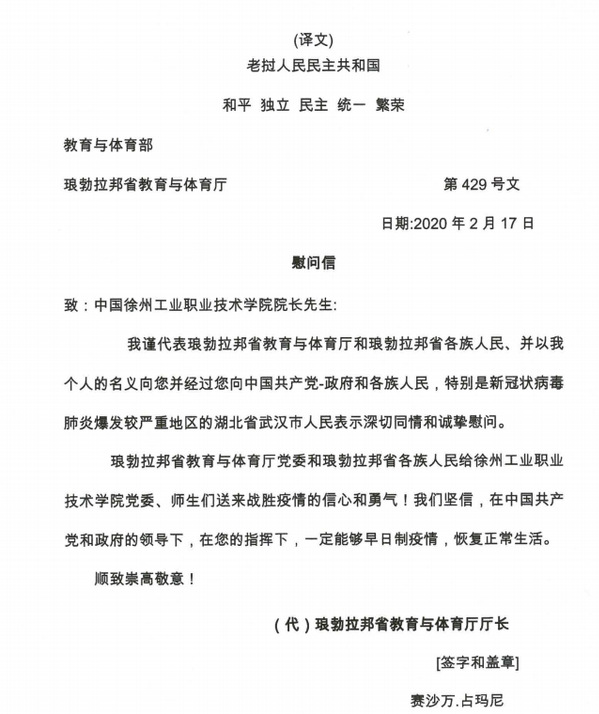 老挝琅勃拉邦省教育与体育厅厅长给我校张登宏院长发来了慰问函。赛沙万•占玛尼厅长代表琅勃拉邦省教育与体育厅和琅勃拉邦省各族人民向我校师生表示诚挚慰问,相信在中国政府的领导下,中国、老挝师生的共同努力下,一定能战胜疫情,恢复正常生活。