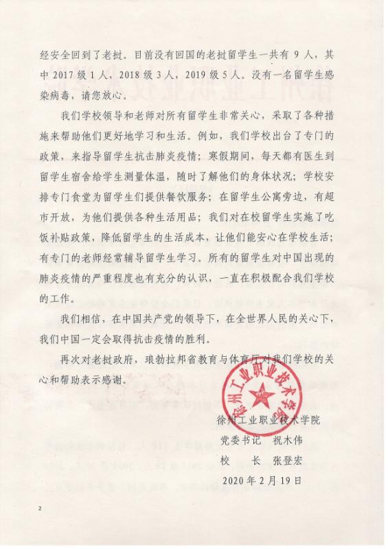 在给各海外合作机构的感谢函中,祝木伟书记和张登宏校长代表学校对合作院校和机构给予我校的关心、支持和帮助表示感谢,并在感谢涵中介绍了我校为留校的留学生们防控疫情所采取的各种措施、提供的各种服务以及目前留学生们生活和学习的状况。相信在大家的共同努力下,一定会打赢这场没有硝烟的战争。