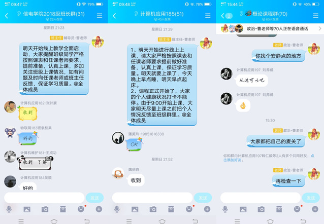 教学联动,强化课堂学风管理。为保障教师教学与学生学习质量,针对线上教学实际情况,二级学院学生管理与教学管理联动,组织管理人员进入班级群查看学生出勤情况,实时掌握各课程学生在线学习情况,及时收集和掌握学生对于线上课程的意见和建议。首日教学结束后,学工处组织各二级学院对本学院学生线上学习情况和存在的问题、建议进行了汇总,共梳理学习平台情况、学生出勤情况、学生在线学习存在的问题等5个方面共计31条反馈。从各学院开课首日的教学情况反馈来看,各学院线上教学秩序井然,效果良好。