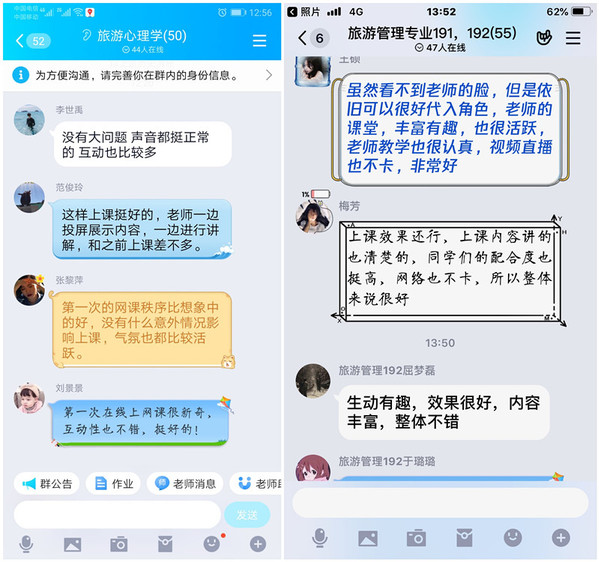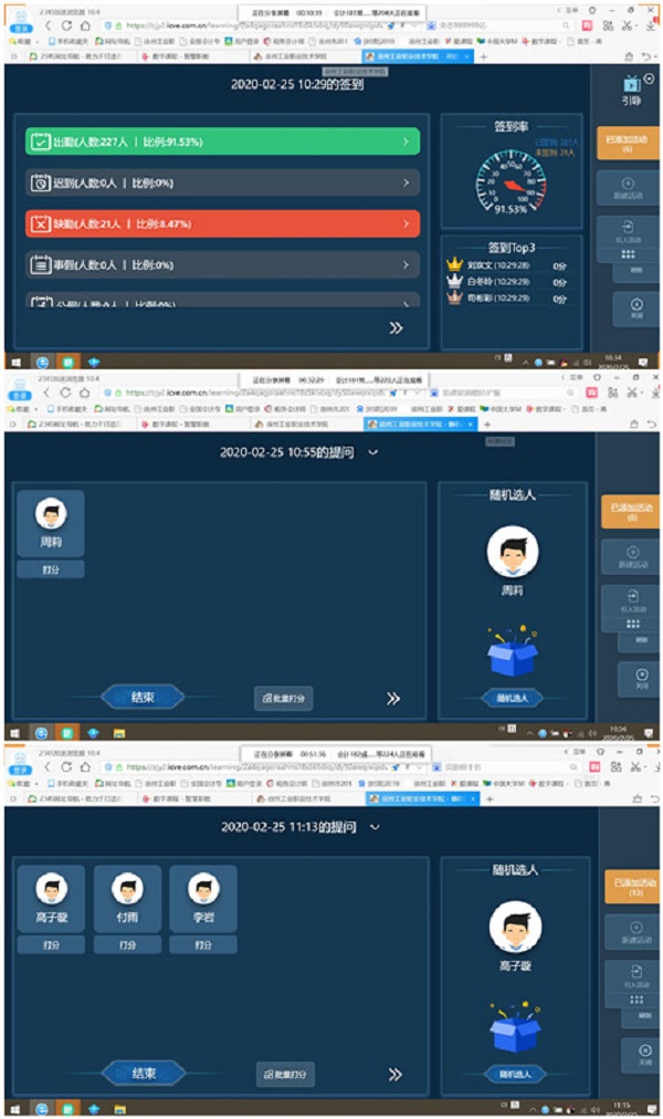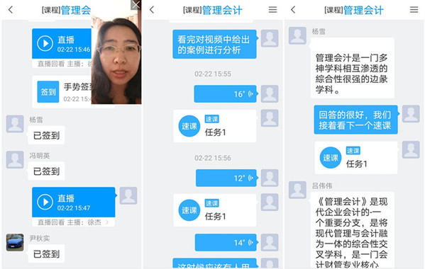 在线上课首日,工商管理学院开设48班次,有1812名学生参与了线上学习。教师们利用智慧职教、超星泛雅、中国大学mooc、爱课程、钉钉、QQ、微信等多种在线课程平台或软件,融合直播、录播、主题讨论、学生语音及视频表达等多种方式进行教学。网络教学总体运行平稳,秩序良好。