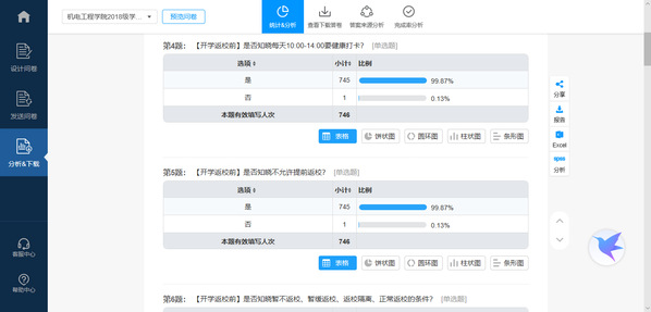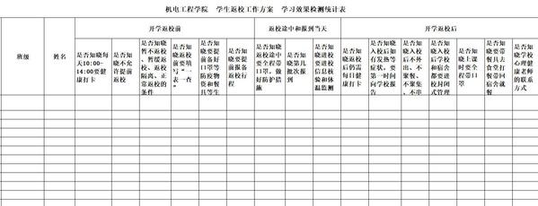 为检测学生学习效果,确保学生熟知返校各项要求,学院设计制作了《机电工程学院<学生返校工作方案>学习效果检测统计表》,并通过填写表格、线上问卷等方式收集全体学生的学习效果反馈。年级辅导员统计结束后,以数据的形式把学生学习情况反馈给班主任,对于部分学生反馈的暂时还未知晓的事项,由班主任进行一对一讲解,确保全体学生准确知晓全部返校事项。