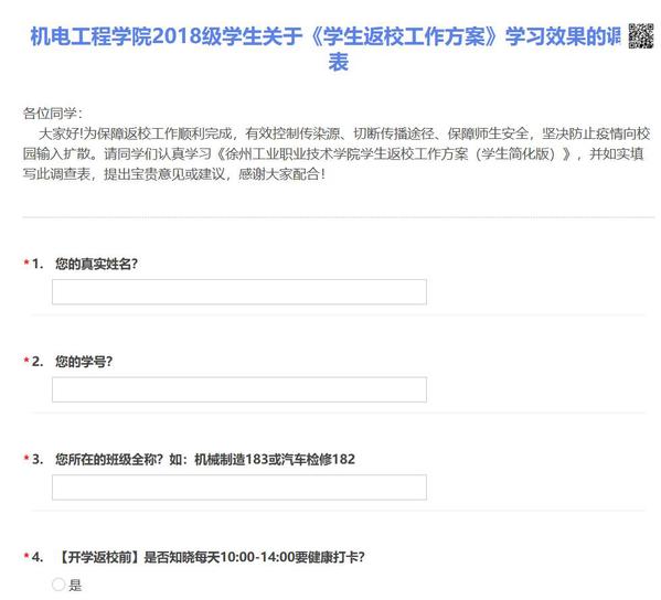 根据学校《关于组织学习我校<学生返校工作方案><疫情应急预案>的通知》要求,机电工程学院党总支高度重视,及时召开总支委员会(扩大)会议,确定了分层次组织全体师生认真学习方案和预案的学习方案,设计了学生问卷调查表,检验学生学习效果,确保做到“不漏一人,不留盲区和死角”。