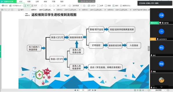 除班主任老师以外,学院剩余28名教职工于3月13日下午通过腾讯会议平台,共同学习了学生返校工作方案教职工简化版,由学院疫情防控联络员周开源老师负责领学。学习结束后,教职工就口罩供应、教学进度、线下教学等问题展开讨论,现场氛围热烈。
