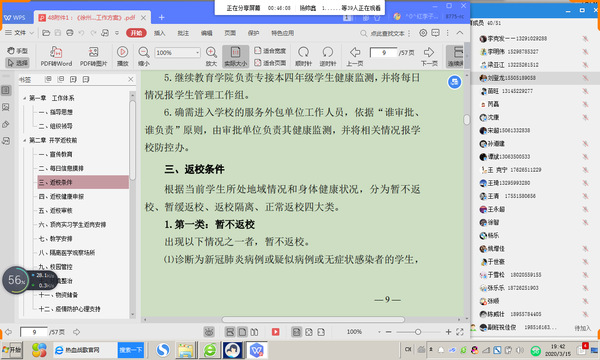 3月13日-15日期间,在各班班主任的带领下,全院2000余名学生通过腾讯会议、腾讯课堂、钉钉课堂、QQ视频等平台,完成对学生返校工作方案学生简化版的学习。会上,班主任老师带领学生逐条学习返校前、返校中、返校后生活学习方面的事项和要求,引导学生要提高责任意识,严格遵守学校规定,根据自身实际情况做好返校准备,确保自己和他人身体健康和生命安全。同时,呼吁家长帮助学生做好物品准备工作,协助学生顺利返校,共同守护学生健康。