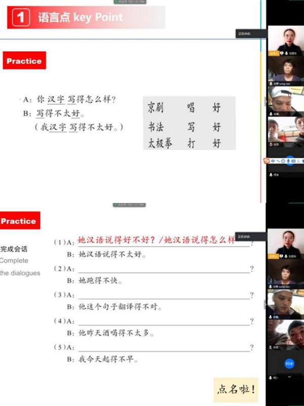线上课堂教学目标能否得到落实,管控学生非常关键。国际教育学院刘亚东老师在《初级汉语综合课基础教程》课程教学中,为避免学生“人在心不在”,采用了“随机摇号回答问题”授课技能,既活跃了学习气氛,又关注与管控了学生的学情,更提升了教学质量。刘亚东老师精选的“例句”、“视频”“故事”均来自于学生真实的学习与生活,留学生课堂充满了趣味性、知识性。