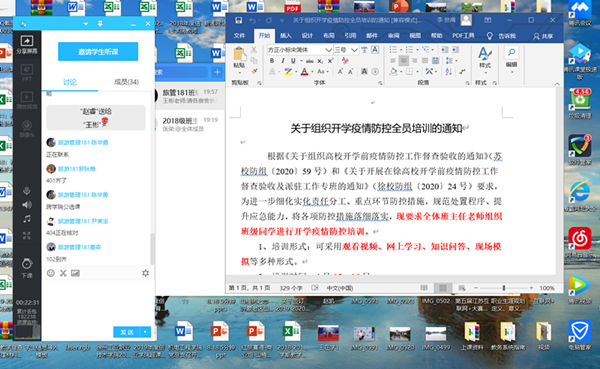 4月15日,学院全体管理人员召开线下会议,根据不同岗位职责进行了针对性的集中培训,从开学条件审核标准、师生到校后防护措施、校园疫情应急处置流程等方面作了详细安排和要求。4月16日,学院全体班主任召开线上班主任会,秦黎明副院长带领全体班主任再次认真学习学生返校方案、预案及生活指南等重要内容,并强调各班主任务必以高度的责任感,对返校方案再学习、再熟悉,对返校信息严格再次审核,及时全面了解学生的思想动态、学习情况和生活状况。学习结束后,班主任就学生返校过程中涉及的问题展开讨论,提出相应意见和建议,辅导员认真进行记录并及时向学校反馈。随后,各班主任通过腾讯会议、腾讯课堂、钉钉课堂、QQ视频等平台召开线上主题班会,采用观看视频、网上学习、知识问答等方式带领学生认真学习《开学第一课--防疫篇(刘向群讲述)》、《疫情防控学生学习生活指南》和《2020年春季开学告知书》等重要内容,积极向学生宣传防疫知识,指导全体学生和家长做好开学前、返校时、开学后的各项准备和防控工作,引导学生提高责任意识,筑牢校园生命安全防线。