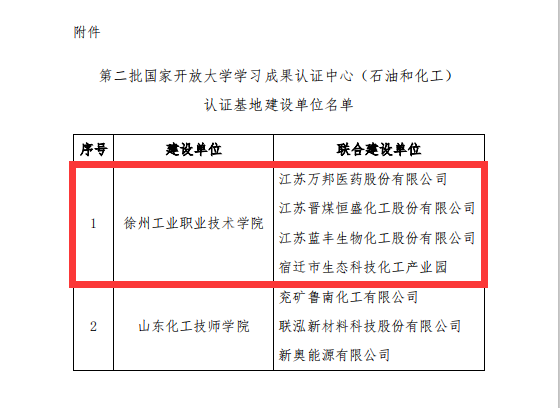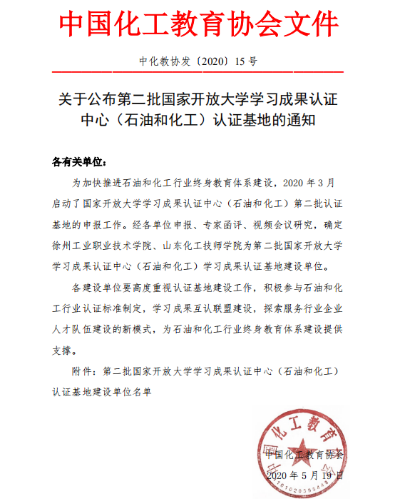 近日,中国化工教育协会发布《关于公布第二批国家开放大学学习成果认证中心(石油和化工)认证基地的通知》(中化教协发〔2020〕15号),我校获批国家开放大学学习成果认证中心(石油和化工)学习成果认证基地建设单位。