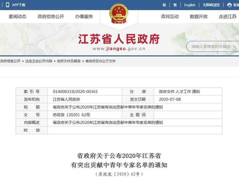 江苏省有突出贡献中青年专家是省政府授予我省专业技术人才的一项重要荣誉称号,从1988年启动以来,每2年评选一次,选拔对象为我省各行业领域做出重大贡献,在省内外产生重大影响,并取得显著的经济效益或社会效益的行业领军人才。