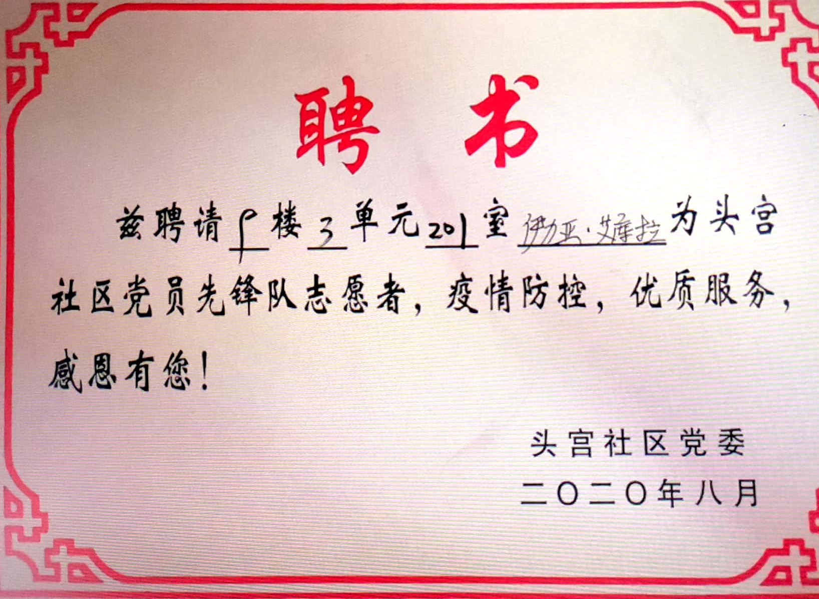 新能源汽车193班的伊力亚·艾库拉是一名新疆同学,在今夏新疆疫情防控严峻的形势下,作为一名大学生的他踊跃报名参加家乡的防疫志愿服务,成为乌鲁木齐市沙依巴克区头宫社区的一名防疫志愿者。伊力亚·艾库拉凭借在学校学习的防疫防控知识,主动到一线配合专业人员开展防疫知识宣传和新冠肺炎病毒患者的排查工作,在持续的高温下身着防护服,不分昼夜,严防死守,不放过任何蛛丝马迹。在完成排查工作的同时,伊力亚·艾库拉同学还主动帮助住户倾倒垃圾、购买生活物品、定时喷洒消毒水。在为期三周的防疫志愿服务中,伊力亚·艾库拉同学感受到参与疫情防控工作的光荣感和责任感,他用实际行动助力家乡防疫防控,用青春力量全力守护家乡平安。
