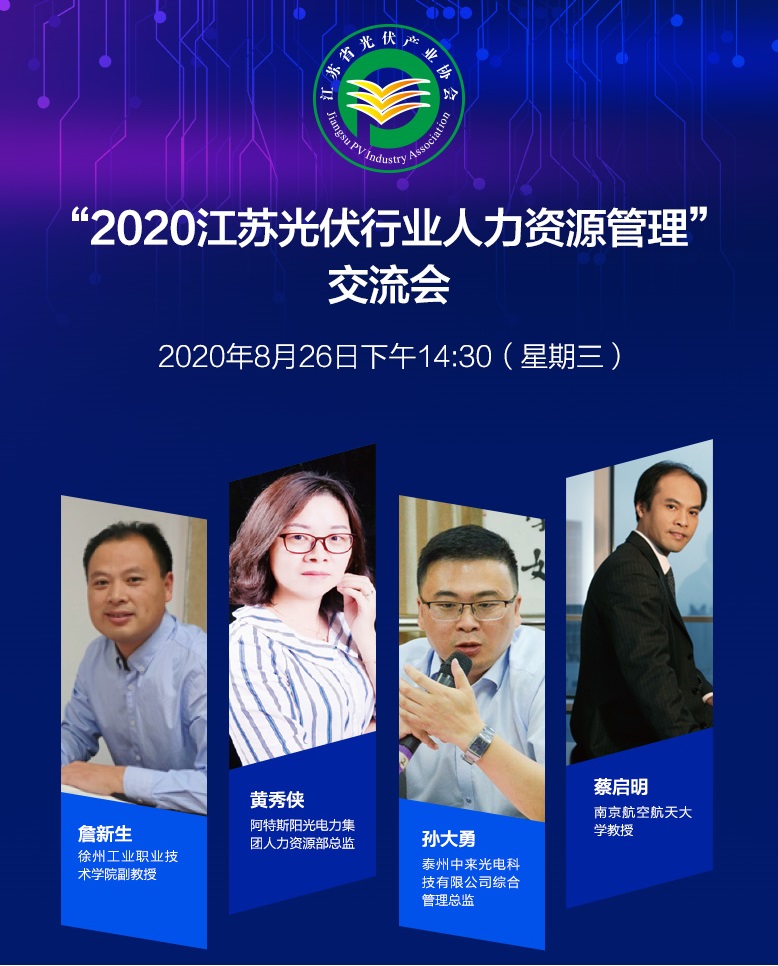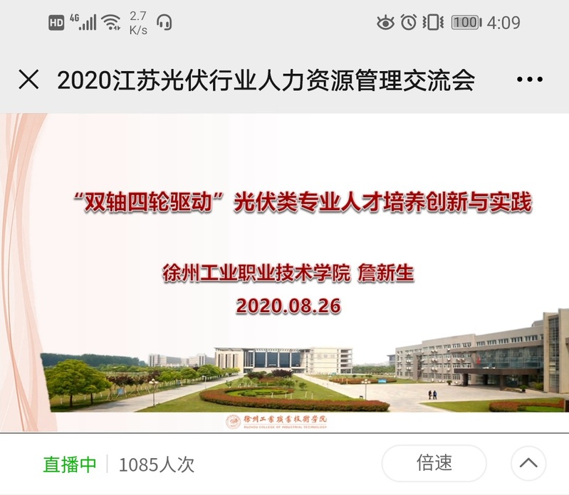 8月26日下午,为有效推动行业发展,助力企业“吸引人才、管好人才、留住人才”,为企业和人才培养单位搭建合作交流平台。江苏省光伏产业协会举办了“2020江苏光伏行业人力资源管理”线上交流会,共有光伏企业人力资源管理人员、大中专院校教师等1000多人参加线上会议。我校汽车工程学院新能源与电子技术教研室主任詹新生副教授应邀参会,并在会上人作了“双轴四轮驱动”光伏类专业人才培养创新与实践的专题交流发言。