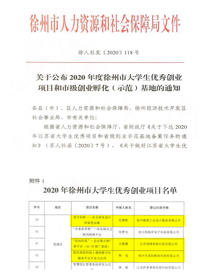 日前,徐州市人力资源和社会保障局开展2020年度徐州市大学生优秀创业项目认定,园区推送3个大创企业项目:疫战到底-企业展示推广新平台、面向高校线上课程数字化服务开发与应用平台、设计创新-自主研发设计师家具品牌入围,每个项目获得奖金10万元,并全部推荐省级大学生优秀创业项目,将另有奖金5万元。