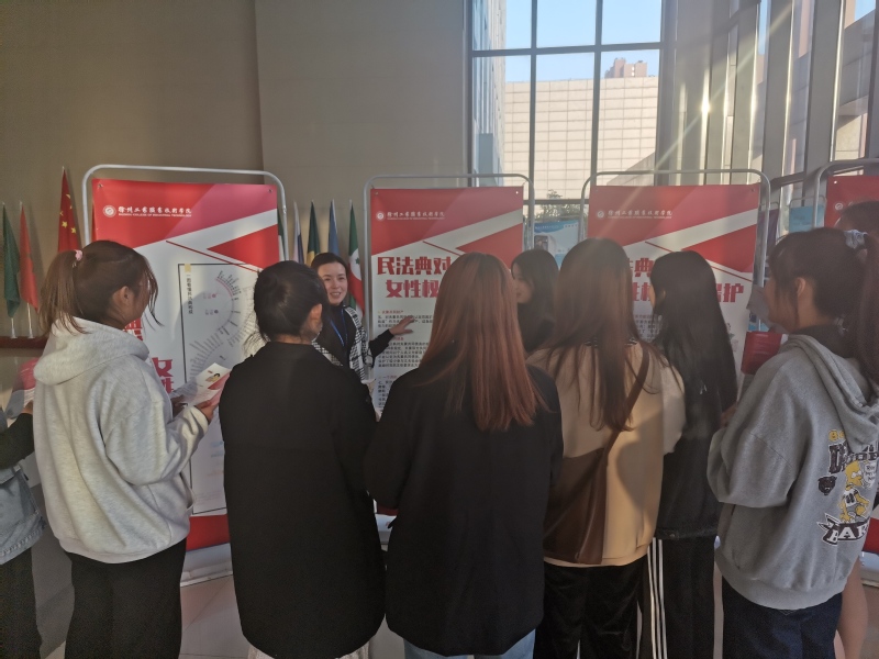 本次活动中,志愿者们深入各二级学院及部门,派发了宣传页,内含婚姻法、妇女权益保护法以及劳动法中涉及妇女的政治权利、文化教育权益、人身权利、财产权、劳动和社会保障权益以及在婚姻家庭中权益等六个方面的内容。并对《民法典》中夫妻共同债务的“共签共债”制度、离婚30天冷静期制度、规定遗产管理人制度等方面制作了宣传板,于B18大厅中展出。