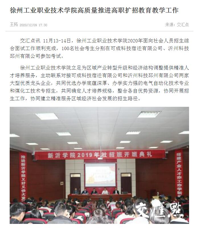 徐州工业职业技术学院立足为区域产业转型升级和经济结构调整提供精准人才培养服务,主动联系对接可成科技宿迁有限公司和沂州科技邳州有限公司两家大型优质龙头企业,共同优选办学底蕴深厚、办学实力强的电气自动化技术专业和煤化工技术专招生,共同确定人才培养规格,整合各自优势资源,协同开展招生工作,协同建立精准服务区域经济社会发展的招生路径。