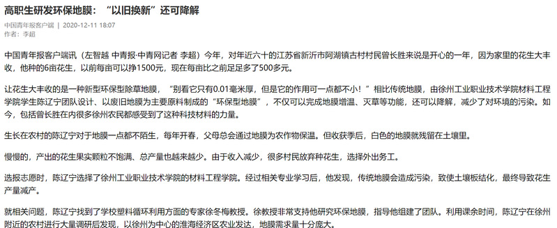 让花生大丰收的是一种新型环保型除草地膜,“别看它只有0.01毫米厚,但是它的作用可一点都不小!”相比传统地膜,由徐州工业职业技术学院材料工程学院学生陈辽宁团队设计、以废旧地膜为主要原料制成的“环保型地膜”,不仅可以完成地膜增温、灭草等功能,还可以降解,减少了对环境的污染。如今,包括曾长胜在内很多徐州农民都感受到了这种科技材料的力量。