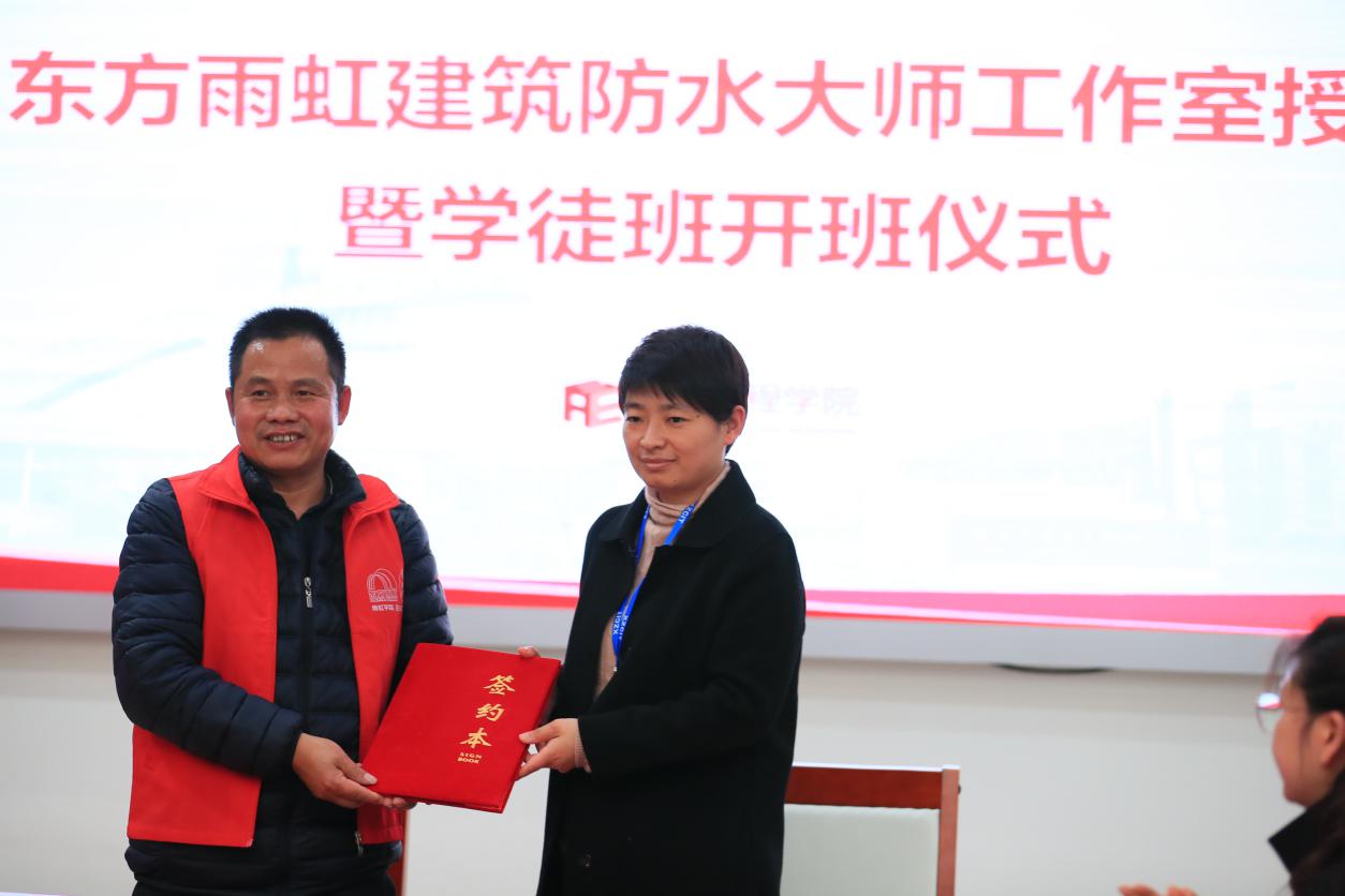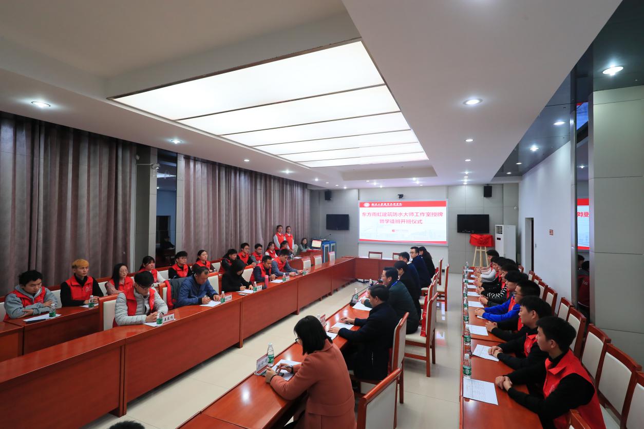 12月10日,建筑工程学院在图书馆视频会议室举行东方雨虹建筑防水大师工作室授牌暨学徒制班开班仪式。