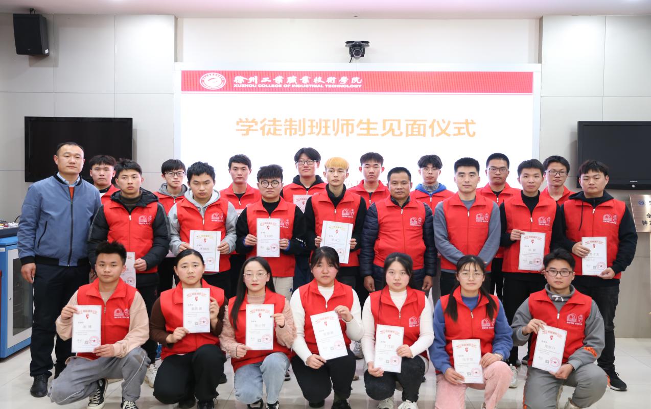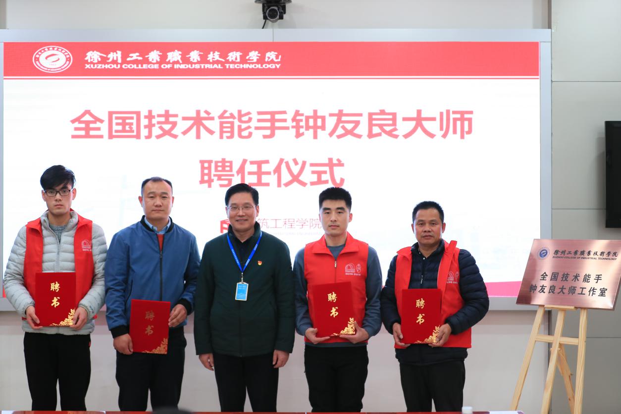 人事处处长孙婷婷代表我校与钟友良大师签订《徐州工业职业技术学院技术技能大师聘任协议》。徐勇书记为钟友良、张广辉、宋合斌、姜东博几位技能大师颁发聘书,并为“全国技术能手-钟友良大师工作室”揭牌。技能大师钟友良为学生颁发录取通知书,周园女士为学徒制班的全体学生讲授了开班第一课。