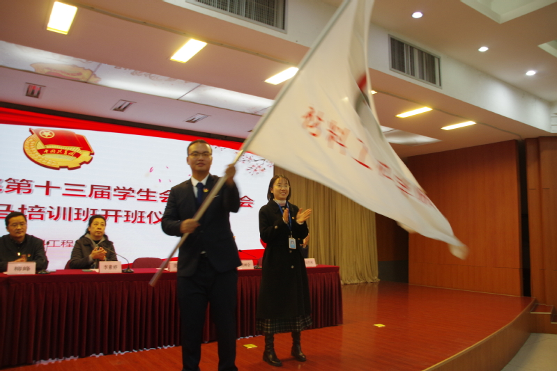 副院长柳峰老师宣读材料工程学院第十三届学生会干部名单。校团委副书记庞世华郑重的为材料工程学院第十三届学生会授旗。新一届学生会主席满帅宣读了本年度学生会工作计划报告,报告从学生会自身的建设、内部协调工作、文体活动、工作创新等方面进行了详细规划。紧接着满帅带领全体学生干部宣誓,一句句发自肺腑的铿锵誓词表达着他们为学生服务的坚定信心。