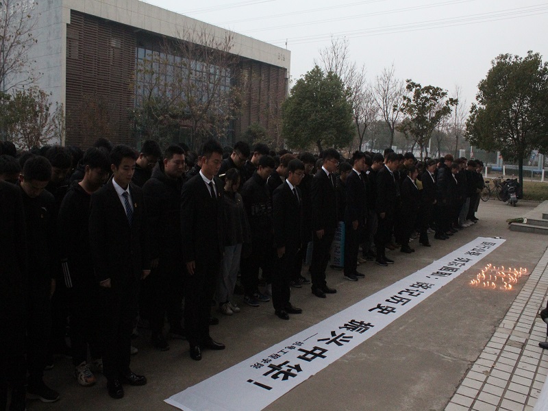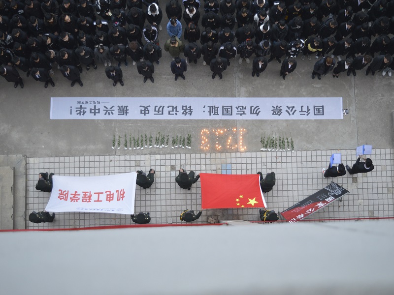 首先,学院团总支组织2020级全体学生重温了南京大屠杀的悲痛历史。全体同学面对蜡烛摆成的“12.13”,集体默哀三分钟,深切缅怀为中国人民抗日战争胜利献出生命的革命先烈和民族英雄。随后,同学们现场共同朗诵了《和平宣言》,面向国旗进行庄严宣誓,并在横幅上签字,以示牢记历史和守护和平,为祖国繁荣昌盛贡献自己力量的决心。最后,全体同学合唱《我和我的祖国》表达对祖国母亲的祝福。
