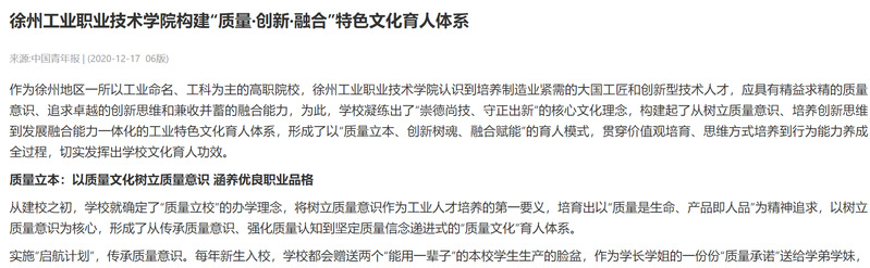 作为徐州地区一所以工业命名、工科为主的高职院校,徐州工业职业技术学院认识到培养制造业紧需的大国工匠和创新型技术人才,应具有精益求精的质量意识、追求卓越的创新思维和兼收并蓄的融合能力,为此,学校凝练出了“崇德尚技、守正出新”的核心文化理念,构建起了从树立质量意识、培养创新思维到发展融合能力一体化的工业特色文化育人体系,形成了以“质量立本、创新树魂、融合赋能”的育人模式,贯穿价值观培育、思维方式培养到行为能力养成全过程,切实发挥出学校文化育人功效。