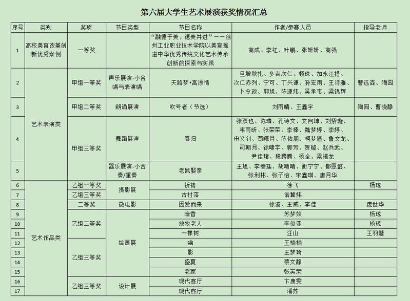 近日,由教育厅主办的江苏省第六届大学生艺术展演活动获奖结果揭晓。我校选送的艺术表演类、艺术作品类作品和高校美育改革创新优秀案例均获奖,其中一等奖3项、二等奖5项、三等奖9项,校长风采奖6项,11人次荣获优秀指导教师奖,共获省赛奖项34个,创我校历史最佳成绩。