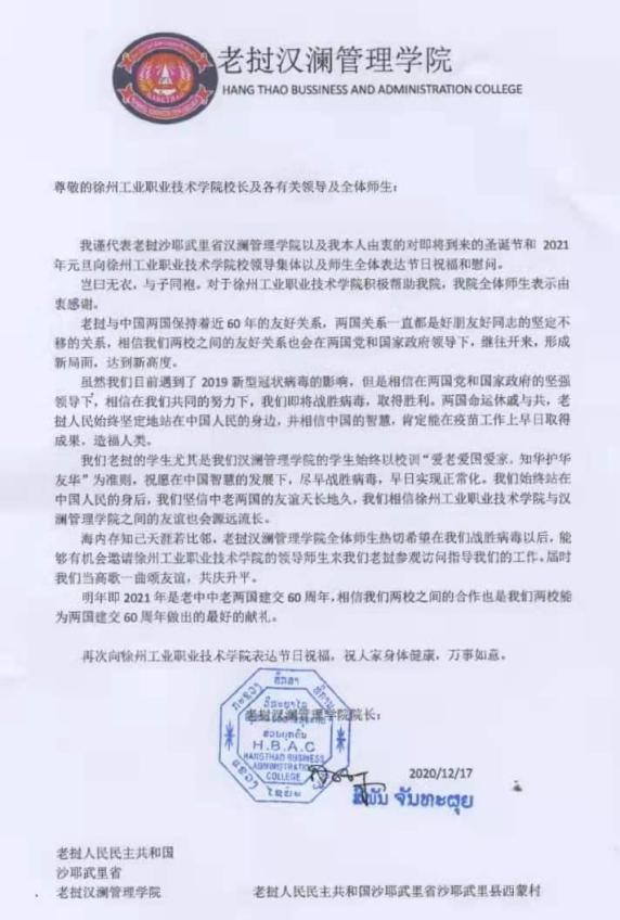 老挝汉澜管理学院院长Bountheuang Mounlasy博士用中文写了一封热情洋溢的信,表示了对我校全体师生的节日慰问,感谢我校在过去对他们学校的各种帮助;期待疫情结束后,继续推动与我校各项国际交流事业的发展,增强两校之间的友谊,并以此作为2021年中老两国建交60周年的最好献礼。