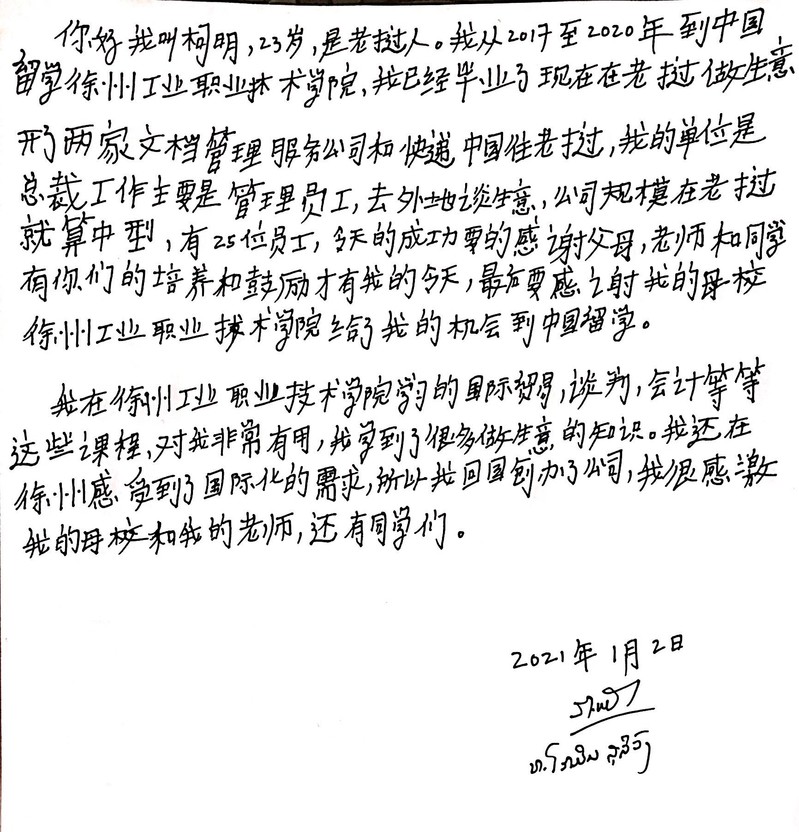 近日,我校2017级老挝籍毕业生SOULIVONG KOMIN(柯明)发来感谢信,表达了对母校培养教育的感激之情,并分享了自己目前在老挝的创业历程。柯明是我校2017级国际贸易专业老挝籍留学生,在校期间曾担任老挝学生自管会主席,无论是学业还是各项活动都表现出色。目前,柯明在老挝开办了一家文档服务和国际物流公司,主要从事老挝与中国的留学服务和物流生意。公司有25名员工,规模在老挝当地属于中型企业。