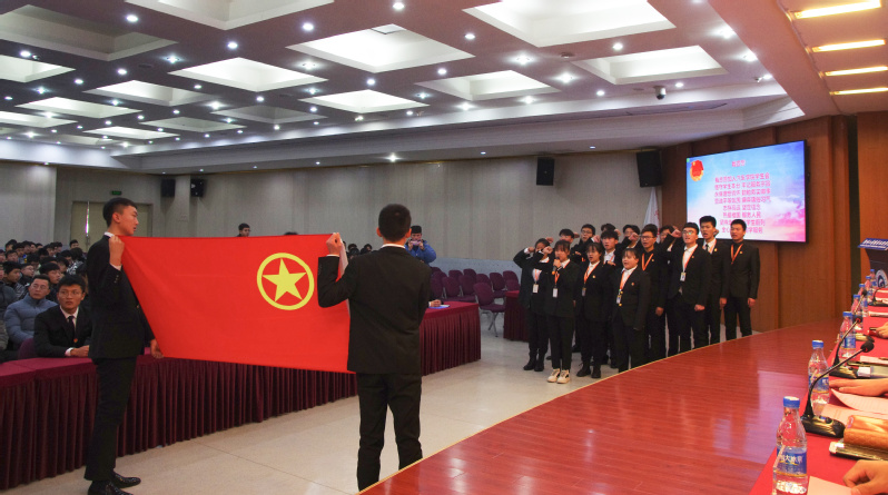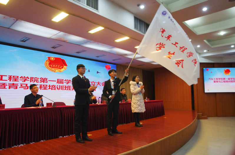 学工处阮处长宣读汽车工程学院第一届学生会聘任名单。全体老师为学生代表颁发聘书,对新一届学生会全体成员表示祝贺并鼓励他们锐意进取、砥砺前行。校团委庞书记向第一届学生会授旗。第一届学生会主席孙宏雨作工作计划报告。全体学生面向团旗宣誓,铿锵有力誓词表达着他们听党话、跟党走、服务学生的坚定信心与决心。