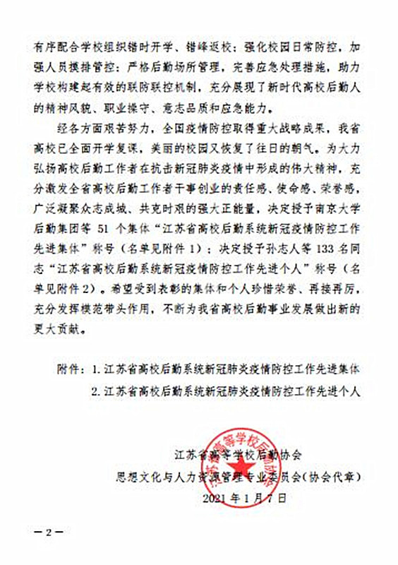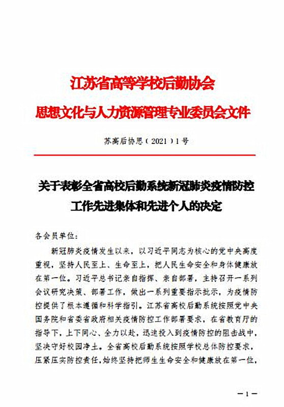 经过各方面的艰苦努力,全校疫情防控工作取得重大成果,在省市等主管部门组织的疫情防控工作专项检查中,多次得到上级领导的充分肯定和高度赞誉。近日,江苏省高等学校后勤协会发文进行了表彰,我校榜上有名,荣获江苏省高校后勤系统新冠肺炎疫情防控工作先进集体荣誉称号。