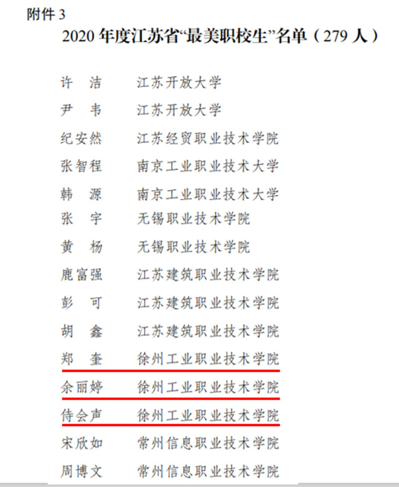 近日,由共青团江苏省委、江苏省教育厅共同举办的2020年度全省“最美职校生”寻访活动结果揭晓,我校机电工程学院侍会声、汽车工程学院余丽婷、材料工程学院郑奎等三名同学荣获“最美职校生”荣誉称号。