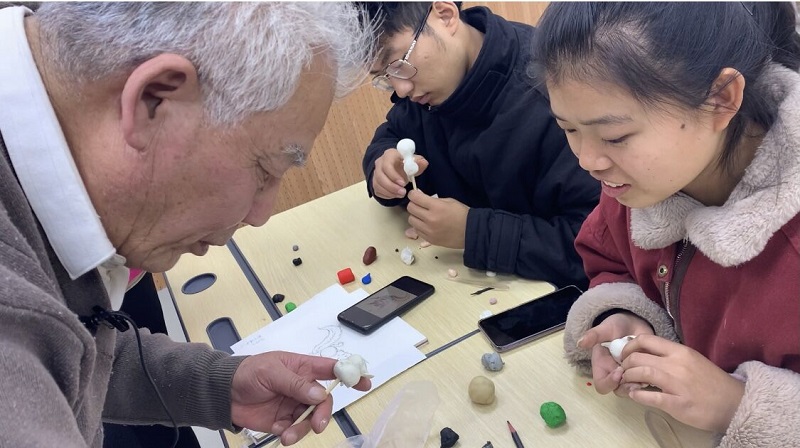 此外,课程教学还请到了徐州市非遗传承人高继汉老师开展非遗文化讲堂,讲座上,高老师从泥塑非遗文化历史源流、制作工艺和传承意义等方面扩展同学们的知识面,提高同学们的鉴赏能力。以“非遗匠心、传统元素”为主题和同学们一起进行泥塑作品创作,一个个惟妙惟肖,憨态可爱的泥塑作品在同学们的手下诞生。