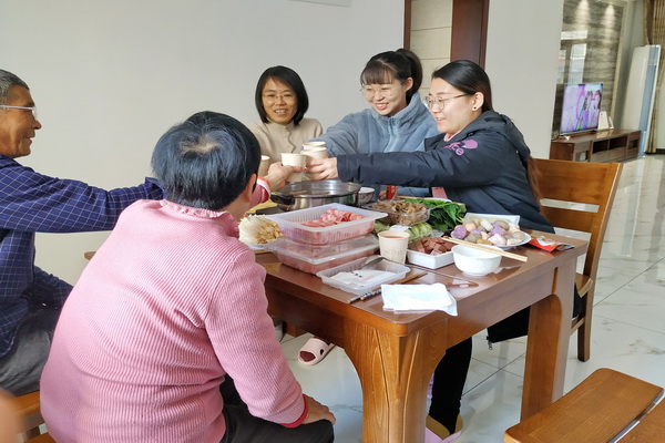 2月11日,为了使留校学生更能感受到家的氛围,位艳宾老师将两位受疫情影响留校的学生接到自己家中过年。位老师带着学生贴完喜庆的窗花和春联,围坐在一起吃热气腾腾的饺子和火锅,大家一起闲话家常,交流各地过节的差异。学生在欢声笑语中感受到家的温馨,并通过视频向父母拜年,得知孩子们在老师家过年,学生家长十分感动,一直道谢。两位学生表示,在学校过年一点也不孤单,学院给大家提供了丰富的年货,良好的住宿条件,在老师家吃到了美味的团圆饭,学院的暖心服务让她们感受到温暖的关爱,缓解了自己的思乡之情,虽在他乡亦是故乡,虽无家人亦有亲人。