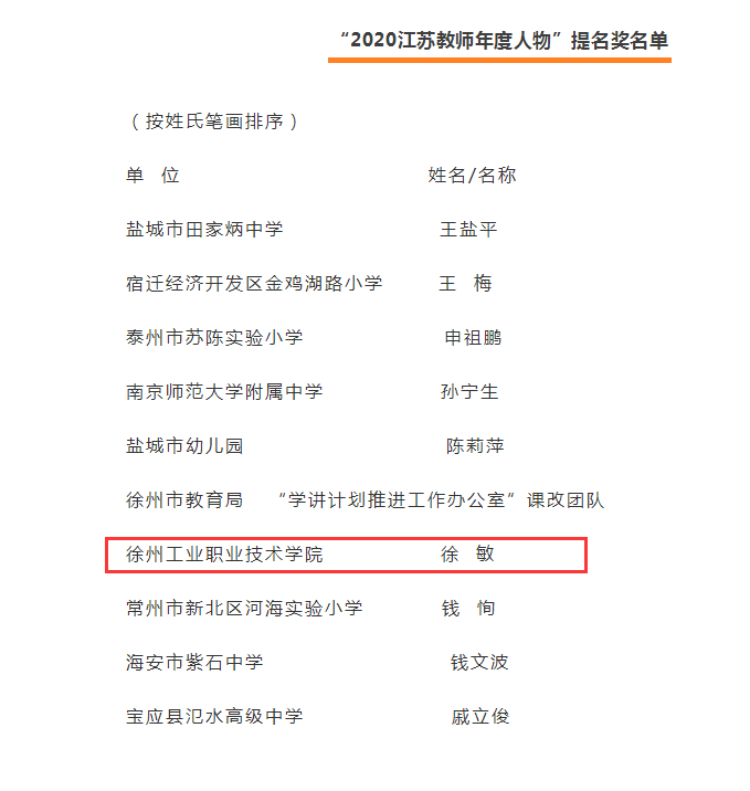 近日,江苏省教育厅公布了“2020江苏教师年度人物”推选活动结果,我校机电工程学院党总支徐敏老师荣获“2020江苏教师年度人物”提名奖。