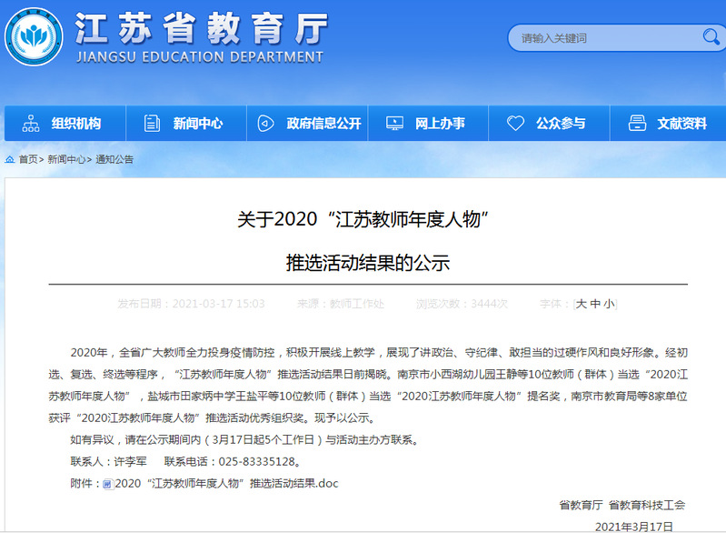 根据《省教育厅省教育科技工会关于开展“2020江苏教师年度人物”活动的通知》(苏教师函〔2020〕27号)文件精神,人事处广泛动员,积极组织申报和遴选推荐。经初选、复选、终选等程序,全省最终确定“10位教师(群体)当选“2020江苏教师年度人物”,10位教师(群体)当选“2020江苏教师年度人物”提名奖,8家单位获评“2020江苏教师年度人物”推选活动优秀组织奖。此次表彰对象都是全省各级各类学校在教书育人、抗击疫情方面作出积极贡献的个人或群体,广受师生好评。