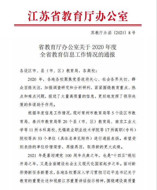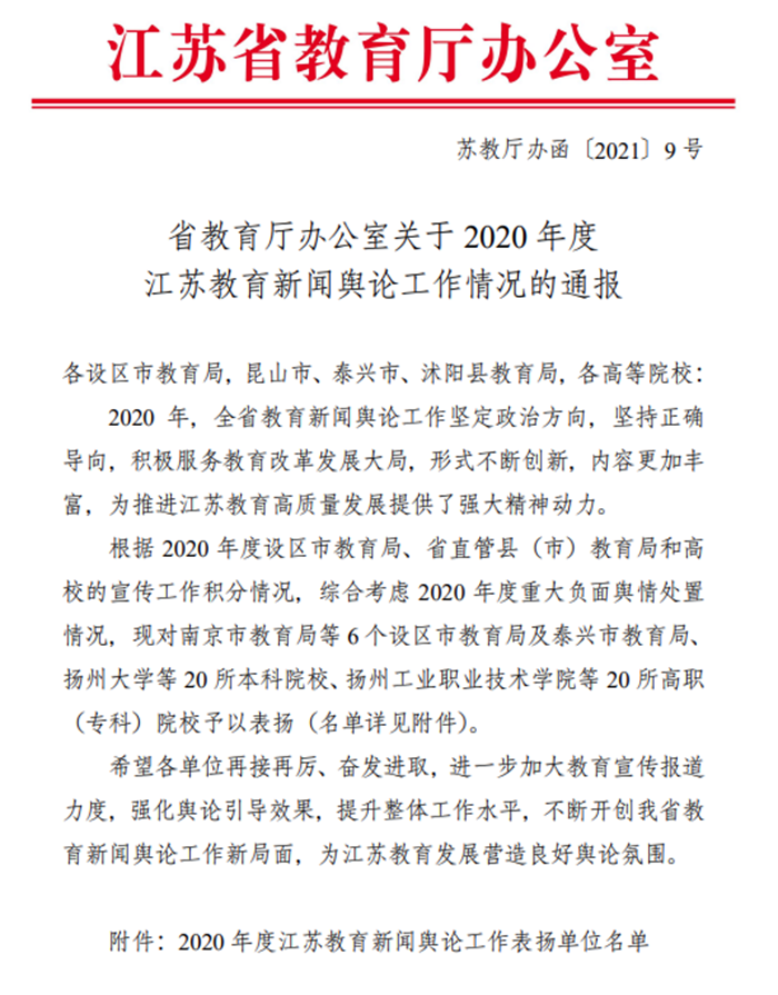 近日,省教育厅印发《省教育厅办公室关于2020年度江苏教育新闻舆论工作情况的通报》(苏教厅办函〔2021〕9号),我校新闻宣传工作再获省教育厅通报表扬。这是我校继荣获“2020年度全省教育信息工作表扬单位”后,在新闻宣传工作方面获得的又一项荣誉。我校新闻宣传工作已连续七年获江苏省教育厅表彰。