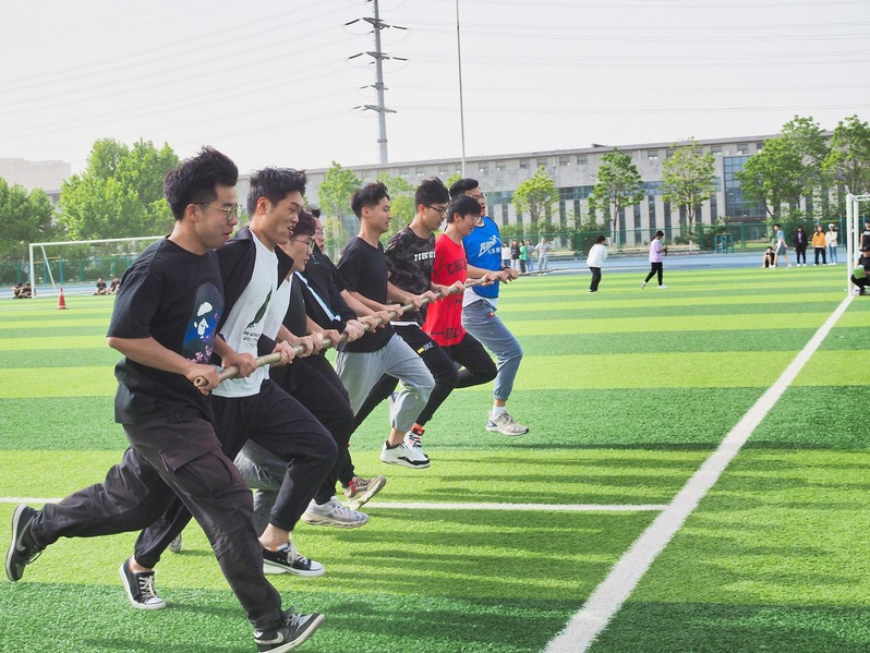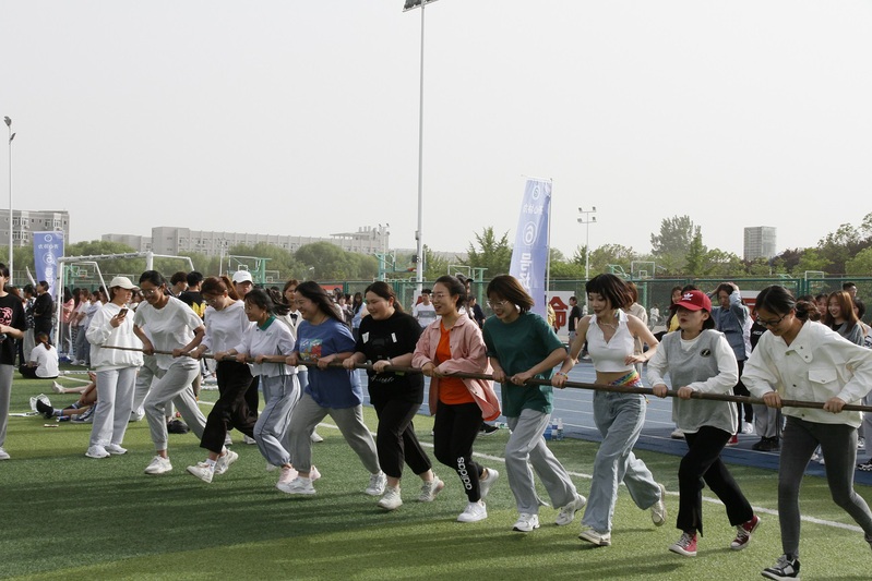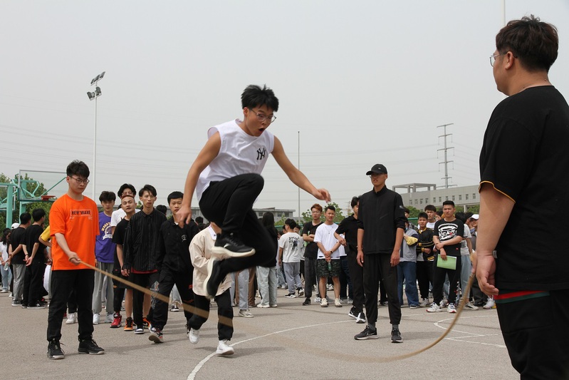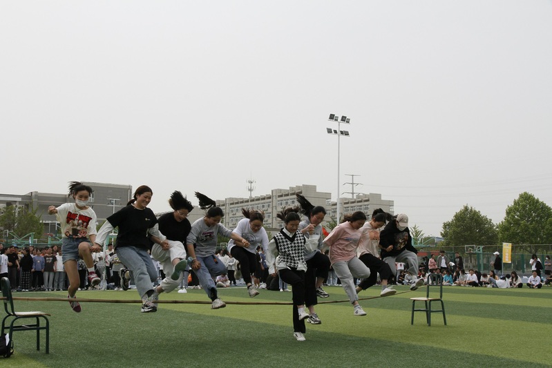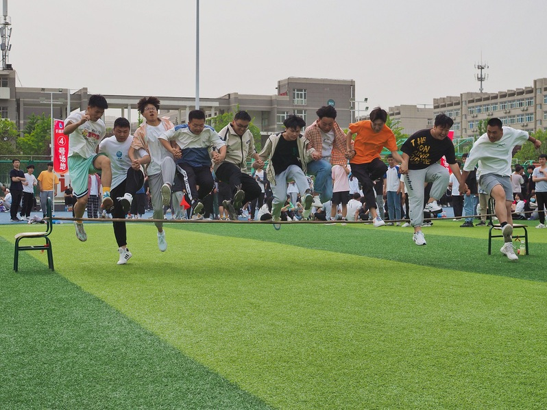 体育文化节已经成为我校传统体育品牌项目,今年是第一次改在春季举办,本届体育文化节系列活动之趣味运动会共设置“跳大绳接龙”、“穿越障碍”、“齐心协力”和“袋鼠跳接力”四个集体项目,全校共有160个班级503支队伍报名参赛,5304人参加比赛,实现了班班都参与,人人有活动的目标。在团队跳大绳接龙项目的赛场上,随着舞动的绳子队员们一个接一个跳过绳子,他们与时间赛跑,彰显的是速度、灵活与队伍的协作配合;穿越障碍项目队员们手拉手比的是配合与协调与共同进退;齐心协力项目中10人同握一根竹竿按照规定的路线一起跑动,比的是集体的速度和配合,体现了凝心聚力的重要作用。赛场上口号声、呐喊助威声、爽朗的笑声此起彼伏,在紧张的学习之余既愉悦了身心、又锻炼了身体更增进了同学之间的友谊,营造了积极向上、团结奋进的校园体育文化氛围。