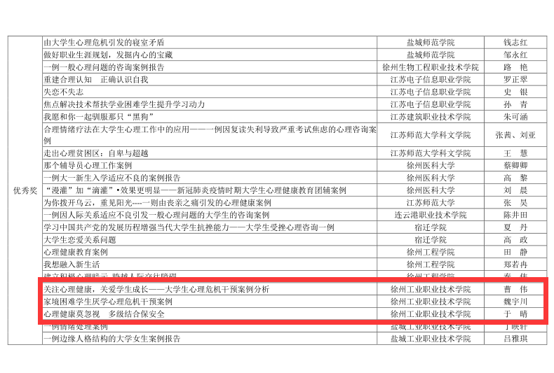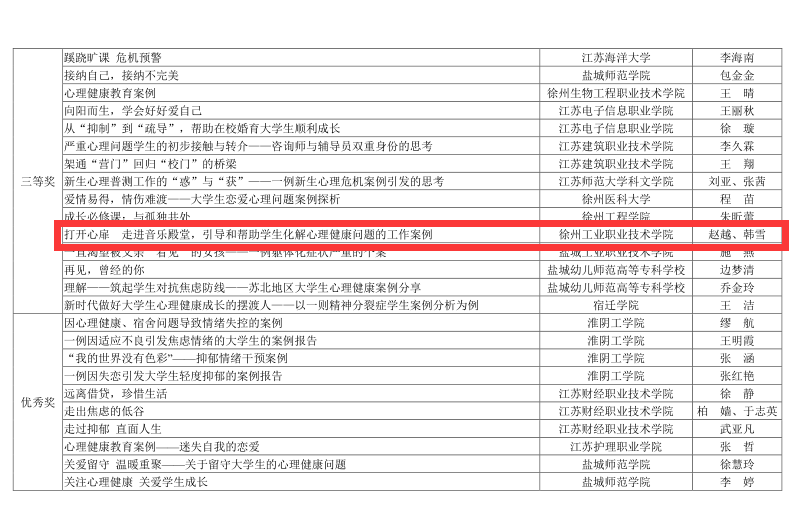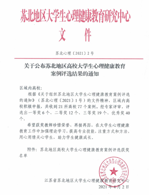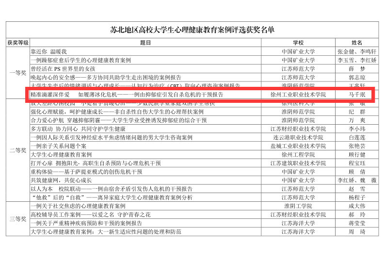 近日,在苏北地区大学生心理健康教育研究中心组织的心理健康教育案例评选中,我校申报的五项案例作品荣获多项荣誉。其中《精准滴灌深伴爱,如履薄冰化危机——一例由抑郁症引发自杀危机的干预报告》(马千珉)荣获一等奖,《打开心扉,走进音乐殿堂,引导和帮助学生化解心理健康问题的工作案例》(赵越、韩雪)荣获三等奖,《关注心理健康,关爱学生成长——大学生心理危机干预案例分析》(曹伟)、《家境困难学生厌学心理危机干预案例》(魏宇川)、《心理健康莫忽视,多级结合保安全》(于晴)荣获优秀奖。