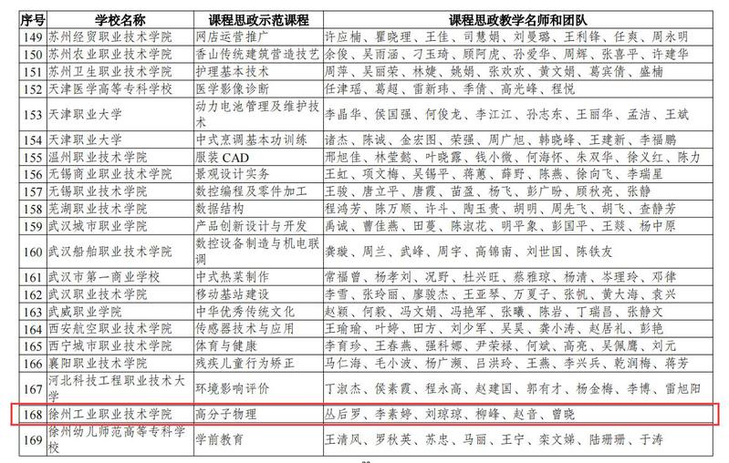 近日,教育部公布了课程思政示范项目名单,我校材料工程学院丛后罗、李素婷、刘琼琼、柳峰、赵音、曾晓等老师共同申报的《高分子物理》成功入选职业教育课程思政示范课程,标志着我校在课程思政建设工作中取得突破。
