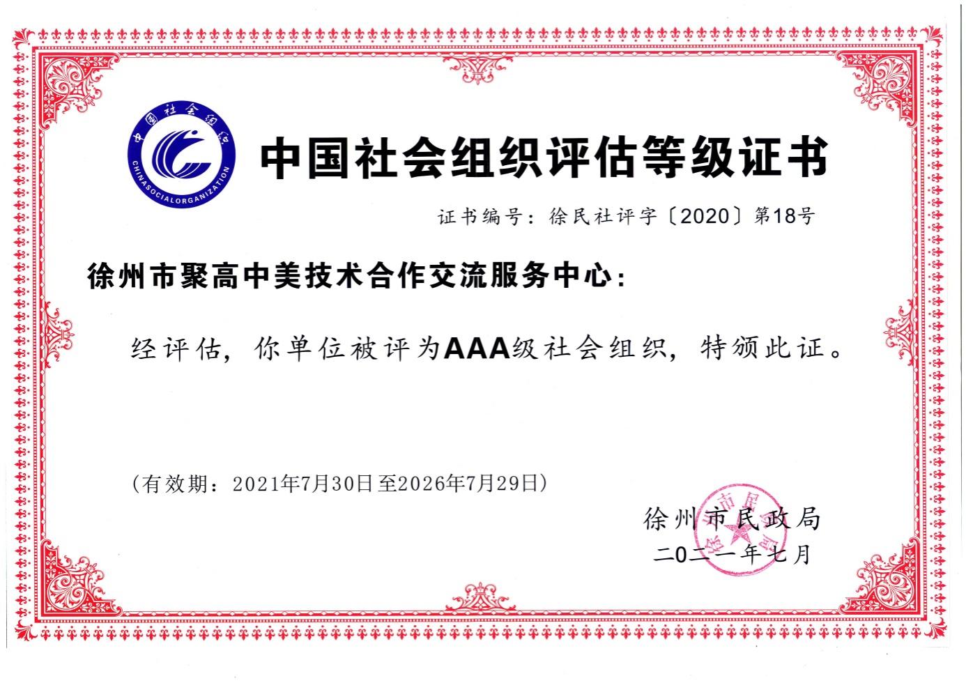 依据民政部《社会组织评估管理办法》(民政部令第39号)、江苏省民政厅《江苏省社会组织评估管理办法》(苏民规〔2010〕3号)等文件要求,围绕基础条件、内部治理、工作绩效、社会评价等四个方面,经徐州市民政局现场考察和综合评估,我校“徐州市聚高中美技术合作交流服务中心”获评中国社会组织评估3A等级。