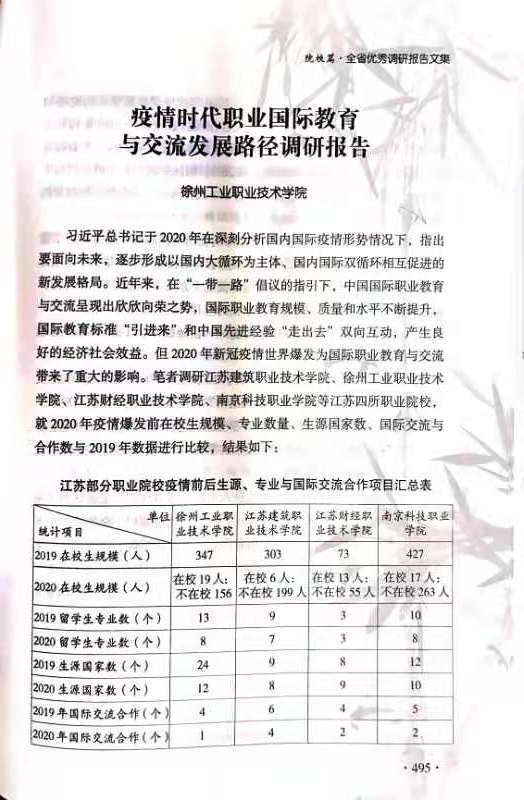为促进全省外事工作的高质量发展,江苏省委外事工作办公室、江苏省人民政府外事办公室于2020年征集全省外事系统国际问题调研报告。国际教育学院王建华和范震波两位老师撰写的《疫情时代职业国际教育与交流发展路径》调研报告,入选《全省优秀调研报告文集》。