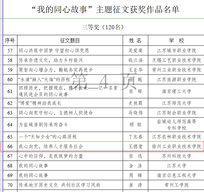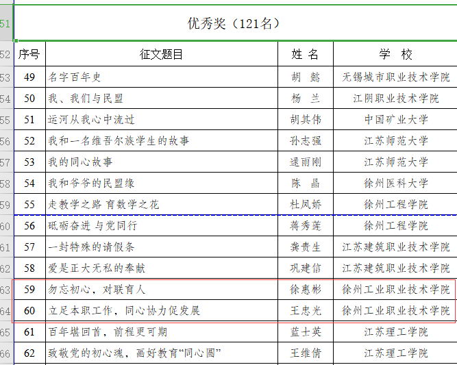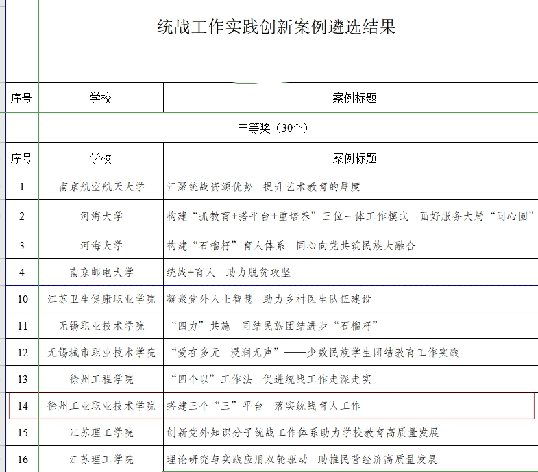 经评审,我校汽车工程学院党总支报送的“搭建三个‘三’平台 落实统战育人工作”获“统战工作实践创新案例”三等奖;在“我的同心故事”评选中,民建会员、化学工程学院王德堂的“我心向党,培养人才服务社会”获三等奖;民进会员、化学工程学院徐惠彬的“勿忘初心,对联育人”,九三学社社员、材料工程学院王忠光的“立足本职工作,同心协力促发展”获优秀奖。