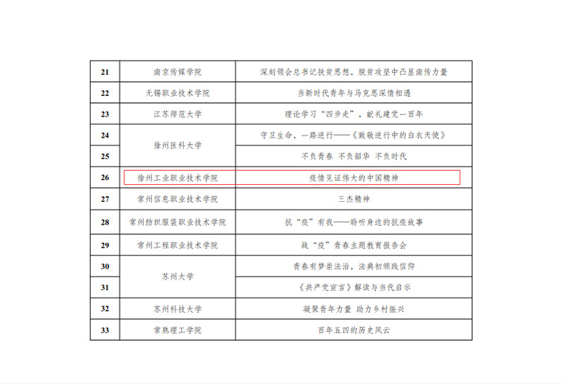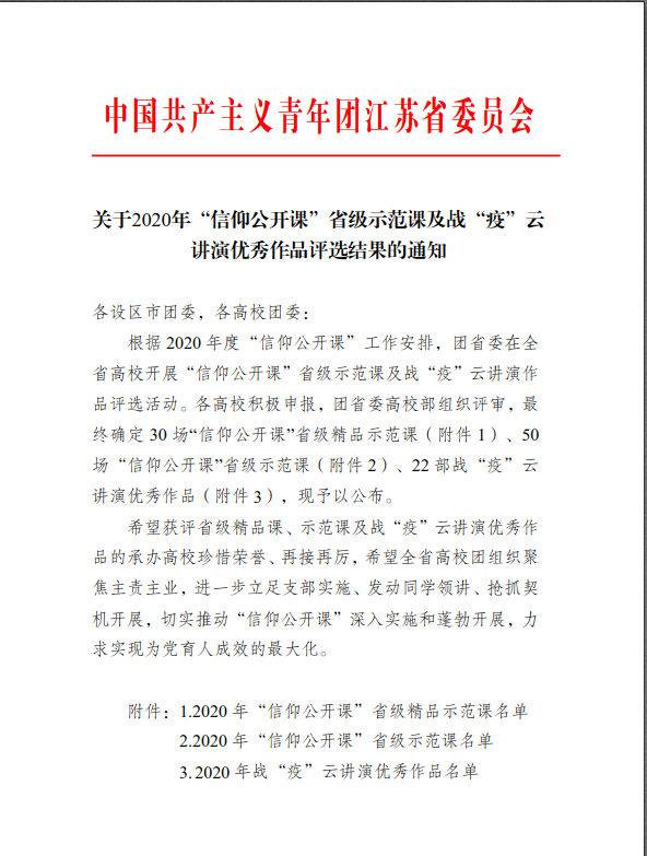 近日,由共青团江苏省委举办的全省高校“信仰公开课”省级示范课评选结果公布,共评出30场“信仰公开课”省级精品示范课和50场“信仰公开课”省级示范课,我校报送课程在全省报送作品中脱颖而出,获评省级示范课。