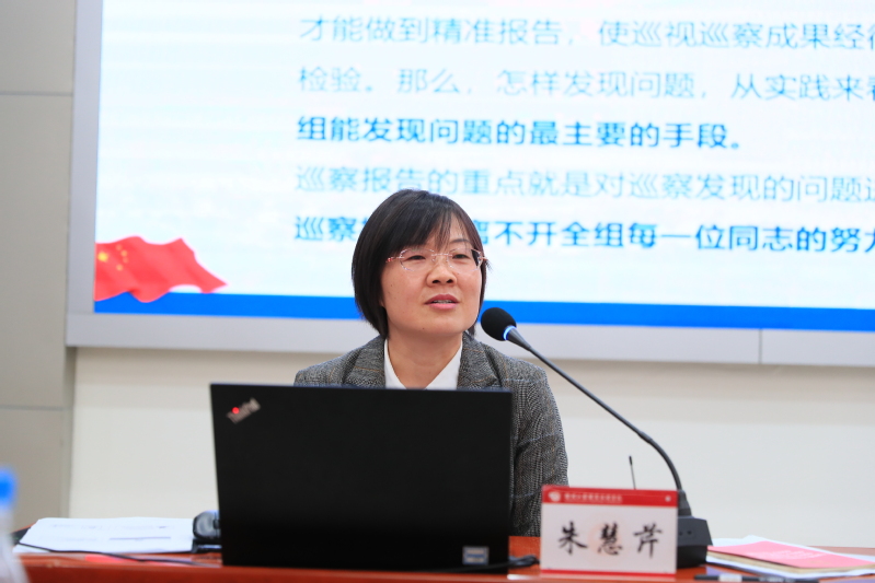 在巡察工作业务培训专题中,纪委副书记、党委巡察办副主任、纪委办公室主任朱慧芹以《高效查阅资料 提高巡察报告质量》为题,讲解了高效查阅资料的三项准备工作、六种基本方法和三点策略技巧,并就如何起草高质量巡察报告,讲解了巡察报告的框架结构、把关校核要求。接着,大家以视频的方式,观看了南京邮电大学党委巡察办朱箭容同志解读省直单位巡察工作流程。