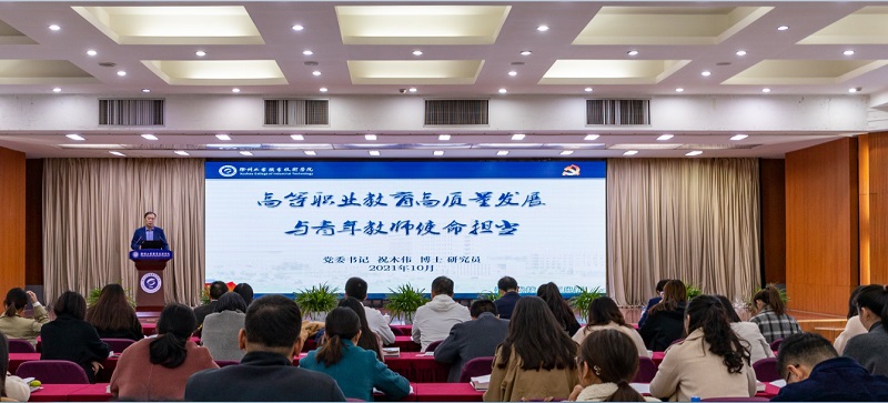 祝木伟书记作了题为《高职教育高质量发展与青年教师使命担当》的报告。他指出,当今最为鲜明的时代特色,就是中华民族伟大复兴战略全局和世界百年未有之大变局的历史交汇。当前的高职教育正面临前所未有之大变革,学校正处在重要战略机遇期,面临的发展任务十分繁重、极具挑战。我们应在变局中开新局,追求更高质量、更有效率、更加公平、更可持续的发展。全面完成国家“双高计划”建设任务,实现争先进位,建成国内一流、海内外有影响的服务区域型高水平本科职业学校。