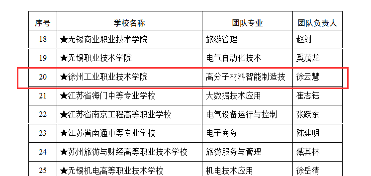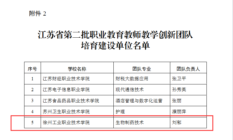 11月18日,《江苏省教育厅办公室关于公布第二批江苏省职业教育教师教学创新团队建设单位的通知》(苏教办师函〔2021〕23号)公布了第二批江苏省职业教育教师教学创新团队建设单位名单,确定我校为第二批江苏省职业教育教师教学创新团队建设单位,“高分子材料智能制造技术”、“工业机器人技术”两个团队入选省级教师教学创新团队立项团队,“生物制药技术”入选省级教师教学创新团队培育团队。
