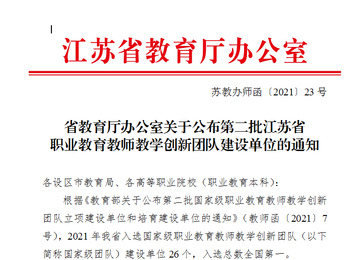 2021年9月,按照省教育厅办公室《关于做好第二批江苏省职业教育教师教学创新团队认定工作的通知》(苏教办师函〔2021〕22号)文件精神,学校高度重视,统筹谋划,精心组织,相关二级学院整合师资及行业企业优质资源,积极申报。截止目前,我校省级及以上教学团队累计达19个。