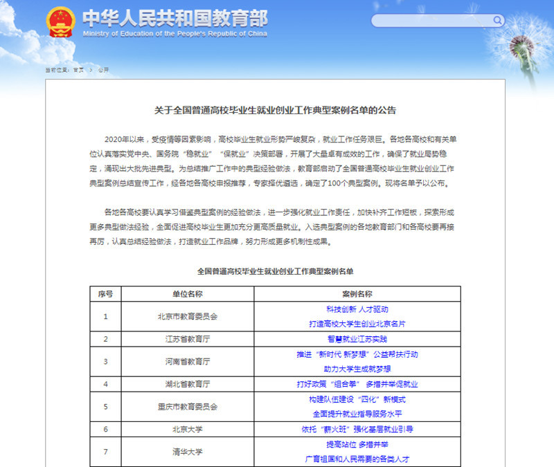 教育部公告指出,2020年以来,受疫情等因素影响,高校毕业生就业形势严峻复杂,就业工作任务艰巨。各地各高校认真落实党中央、国务院“稳就业”“保就业”决策部署,开展了大量卓有成效的工作,确保了就业局势稳定,涌现出大批先进典型。为总结推广工作中的典型经验做法,教育部开展了首届全国普通高校毕业生就业创业工作典型案例评选工作,该项评选是全国大学生就业工作关注度最高的评奖,各高校总结提炼就业创业先进经验,经省教育厅推荐、教育部遴选,共评选出全国高校100个典型案例,其中,全国高职院校30所入选,江苏省高职院校仅2所入选。相关成果将由教育部在全国范围进行广泛宣传和推广。