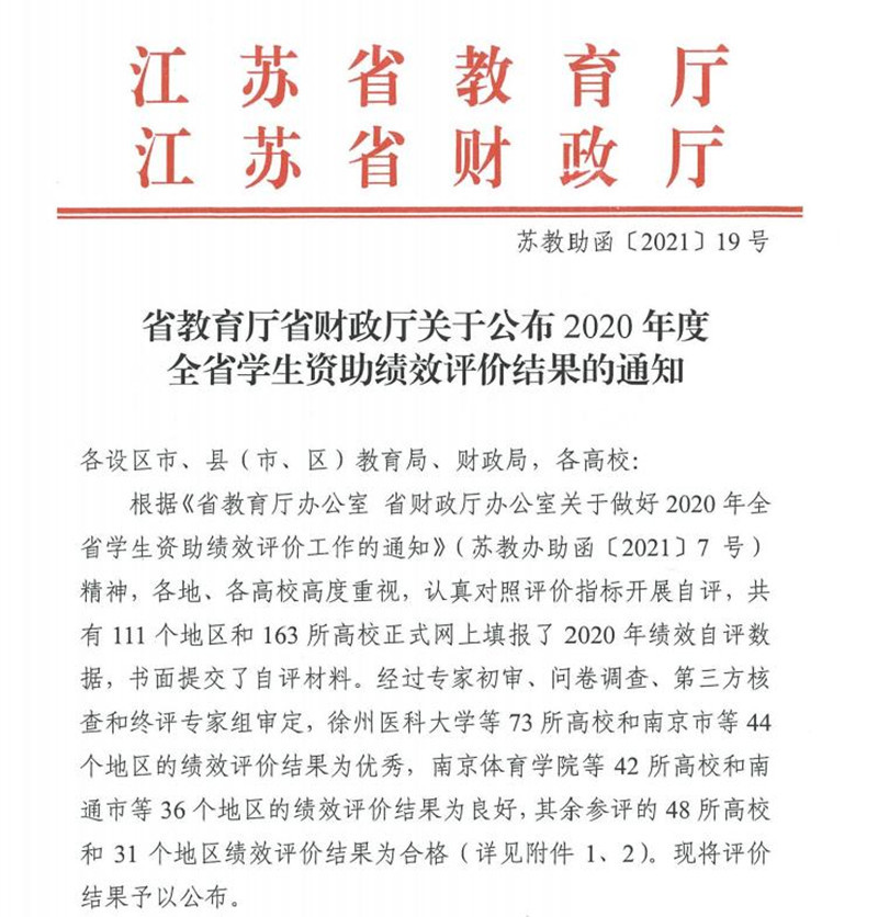 近日,江苏省教育厅、江苏省财政厅联合下发了《关于公布2020年度全省学生资助工作绩效评价结果的通知》(苏教助函〔2021〕19号),我校荣获“2020年度江苏省学生资助绩效评价优秀单位”,这是我校连续四年获得“优秀”等次。