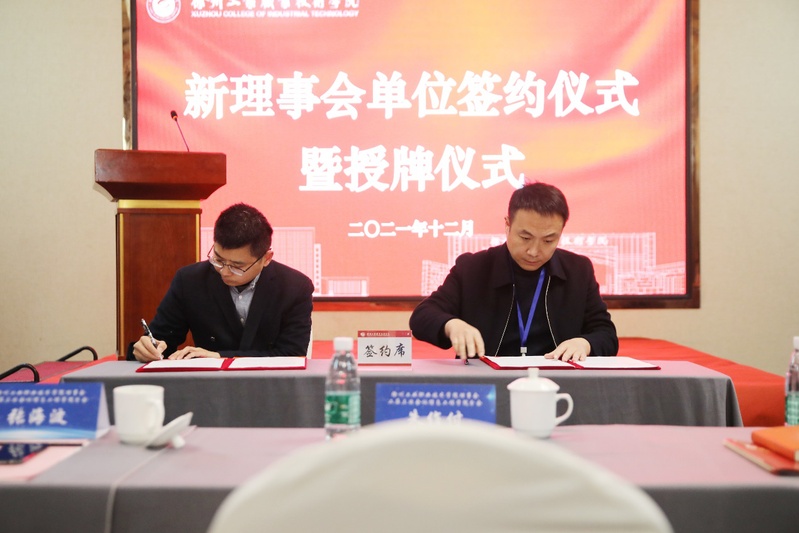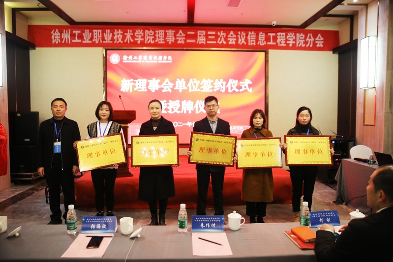 张海波主任代表学院与作为企业代表的北京元工国际科技股份有限公司签约,分两批为9家新理事单位进行授牌。徐州智启电子科技发展有限公司作为新理事单位代表进行发言,公司创始人为我校优秀校友,在学校和老师的栽培下,在与我校进行深度校企合作下,经过一步步成长、锻炼,现公司已成为立足徐州、辐射淮海的知名企业。