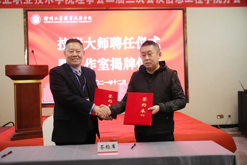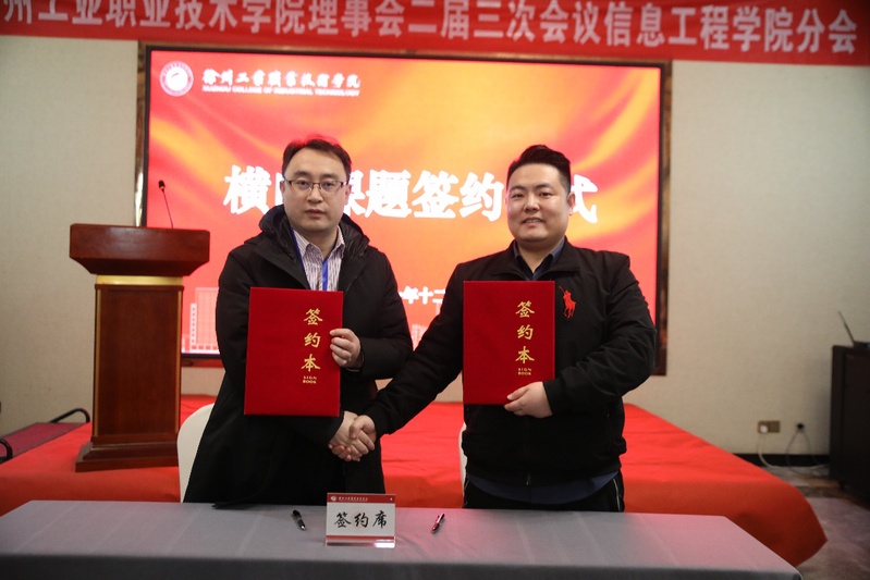 会上,陈祥章院长与中通服网盈科技有限公司装维支撑经理赵洋签署技能大师协议,并对技能大师工作室进行揭牌。杨勇副院长与徐州智启电子科技发展有限公司签署横向课题研究协议。我校副理事长单位江苏新碟数字科技有限公司董事长、我校优秀校友邢刚先生对校企合作、产教融合的情况进行了介绍,并表示在将来接收信息工程学院更多的学生到企业进行实习与就业,会议期间,各位企业代表积极发言对明年的工学交替和校企合作给出许多建议和期待,希望在专业建设、课程建设和师资队伍建设中强强联合培养出更多的优秀学生。