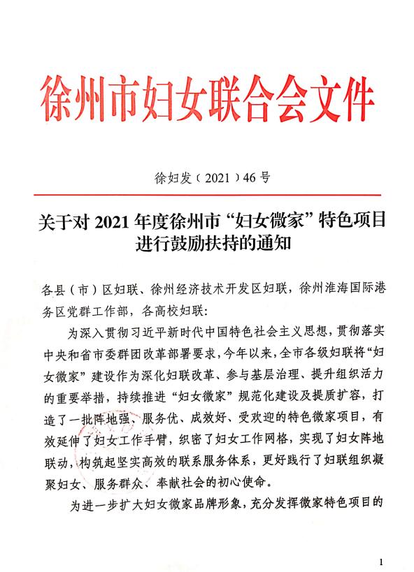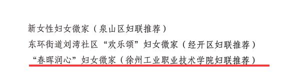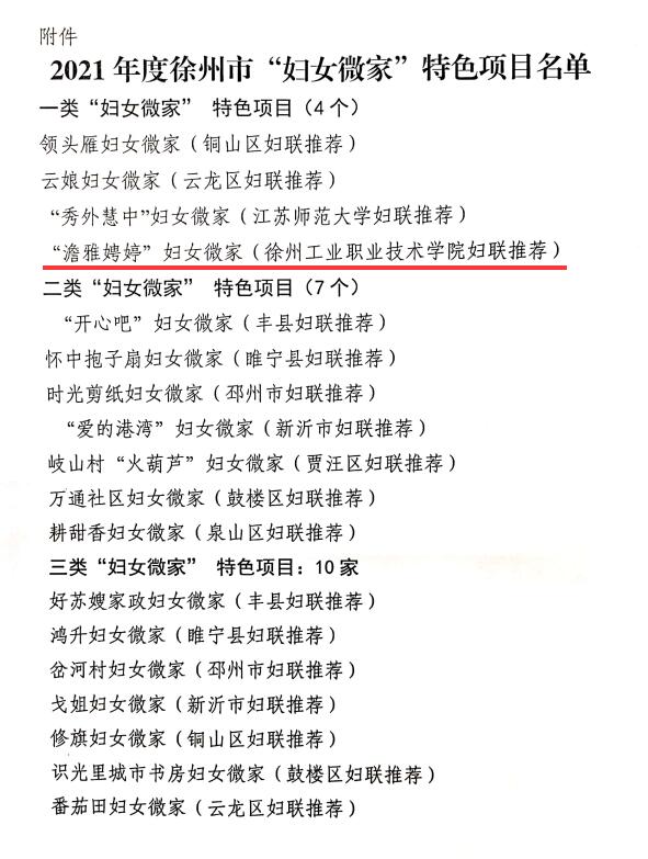 日前,徐州市妇女联合会开展了2021年度“妇女微家”特色项目申报展示活动,我校推荐的“澹雅娉婷”和“春晖润心”两个项目获荣获“妇女微家”特色项目,我校也是全市唯一一个荣获两项扶持奖项的单位。
